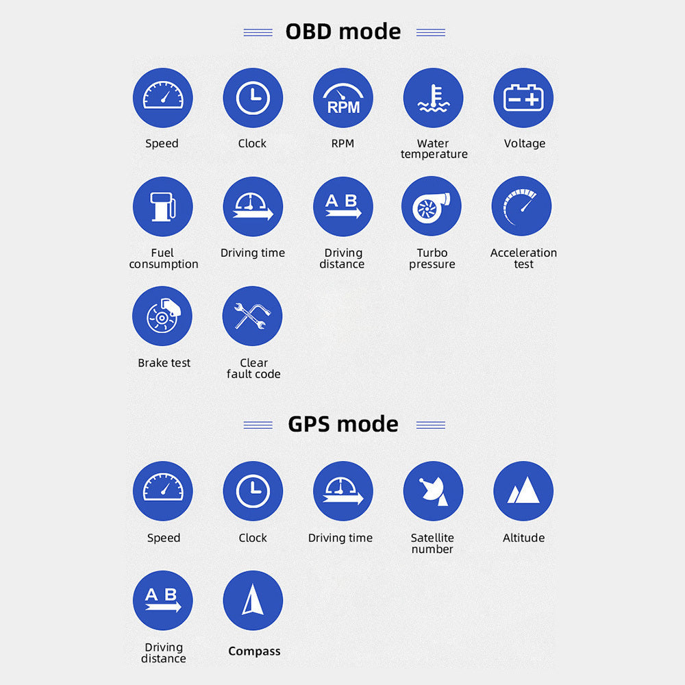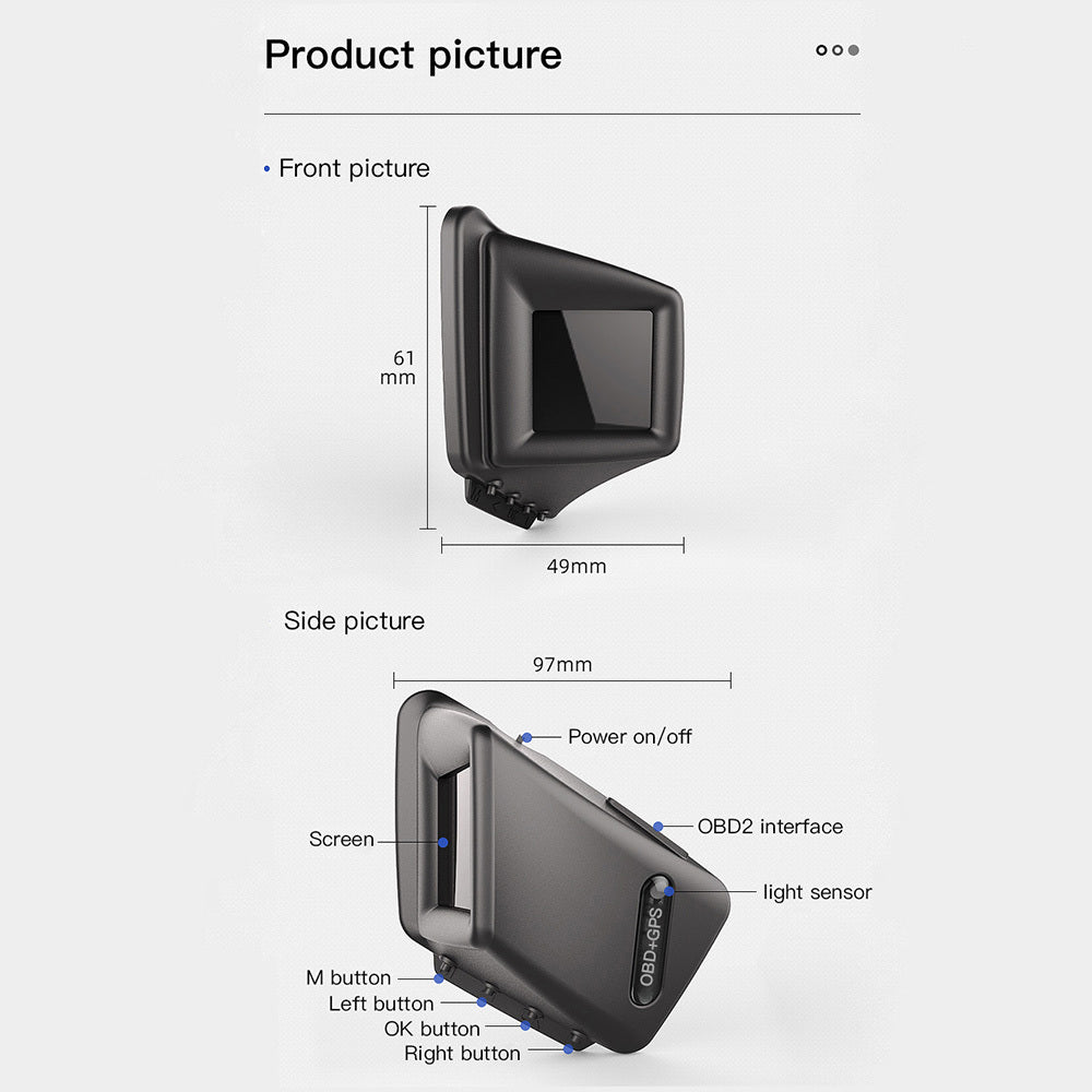 Product information: Material: PC+ABS Type: Car LCD monitor Model: AP-1 Screen type: 2.5 inches Screen size: 61x49 mm Appearance size: 61x49 (mm) Colour: Black Weight: 0.2 (Kg) Resolution: 3000 lumens Function: A-pillar installation of OBD+GPS smart HUD LCD code table dual system